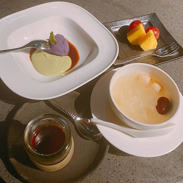 甜點也很多可以選擇,包括抹茶紫薯泥這蠻好吃的!不是冰淇淋~但吃起來很有冰淇淋的口感,還有銀耳蓮子湯,還有黑糖手工布丁可以選,都是3選1,我為了拍照請他們拿出來借我拍~以及附贈的時令水果!都是