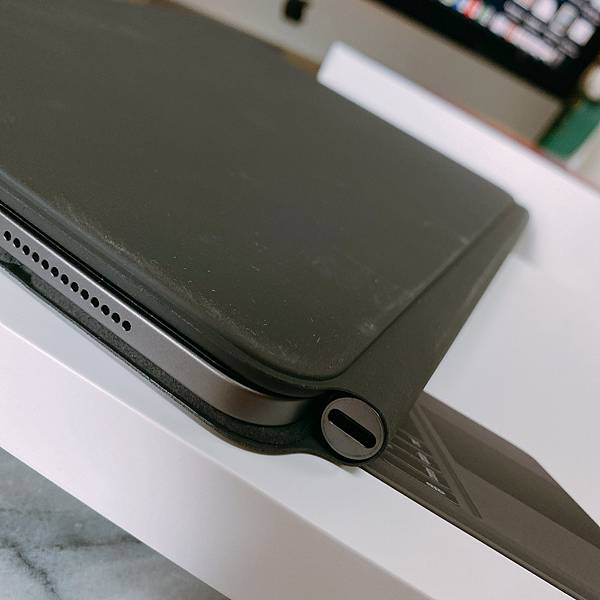 而這巧控鍵盤一大特色就是還有這轉軸處多了了一個個 USB-C,就等於放上iPad後,多了一個口可以充電,甚至是可以外接螢幕顯示的線之類的直通充電功能,使用上就更多元方便。