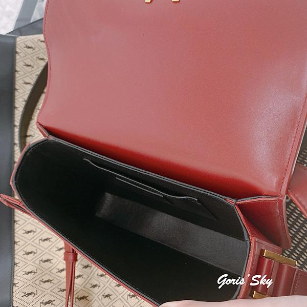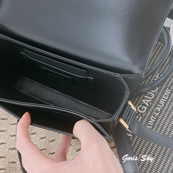 在這次的YSL旋轉腳SOLFERINO包,分層也蠻細緻,打開來前面一個小霞層,中間一個大方層,裡面還有一個小卡層,後面還有一個小分層,包包相當方正、挺,內裡也是通用BOX LEATHER 頂級小牛皮,所以觸感很好,同時也很挺很方正,並且很夠裝。