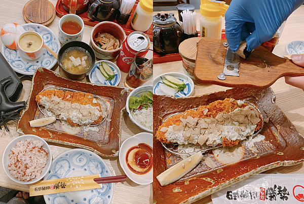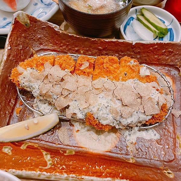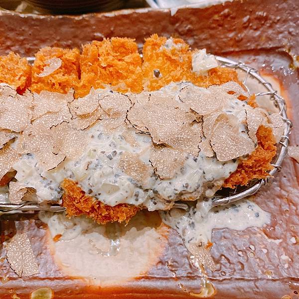 而且~用心的是,這款勝勢日式黑松露豬排炸好上菜擺盤好後,店員也是會直接拿整棵松露在你桌邊服務現刨給你看,完全不作假、不馬虎,整片蓋好蓋滿就完全完美!現刨的過程中你還能聞到你松露的香氣,享受視覺的快感,完全不是跟你在那邊刨個幾片就結束喔!就是幫你刨到蓋好蓋滿整片豬排!