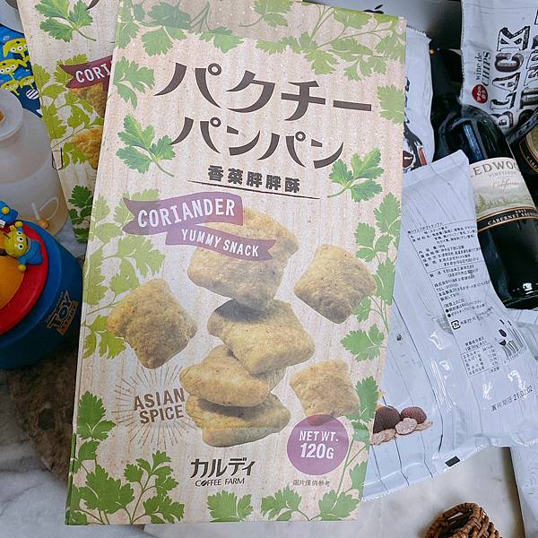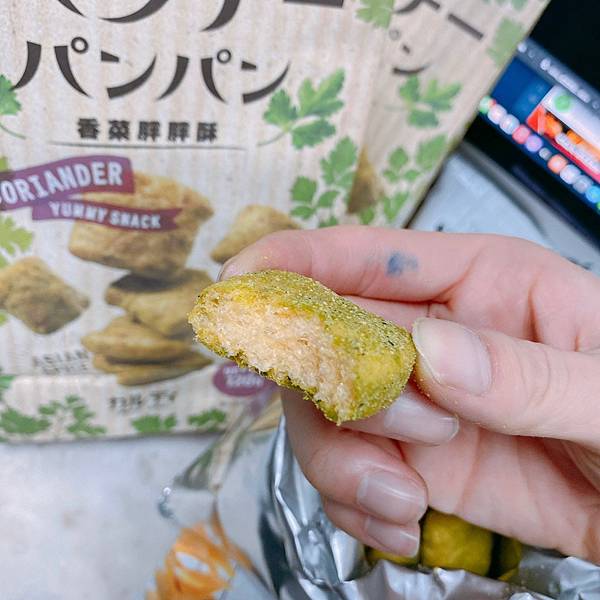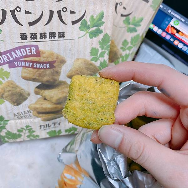 而這香菜胖胖酥,顧名思義就是有香菜外,好吃到我也囤了4包,目前已經一個人嗑2包了,太有魔力了,完全拐著你一塊接一塊一直吃!那