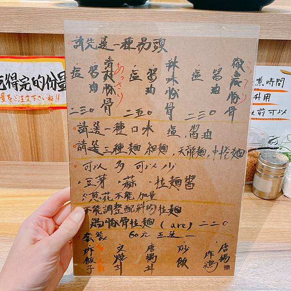 價格可以說超合理的CP值超高,都是著名的豚骨為基底,230元起,可以選清爽、微濃、辣味三種豚骨,然後再選鹽味或醬油,一共細麵、天龍麵、中捲麵三種麵可以選,配料都加量或較少的客製化。
