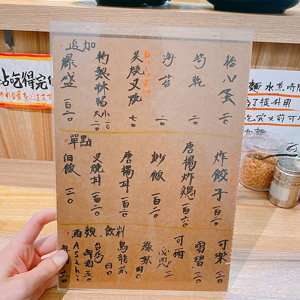 價格可以說超合理的CP值超高,都是著名的豚骨為基底,230元起,可以選清爽、微濃、辣味三種豚骨,然後再選鹽味或醬油,一共細麵、天龍麵、中捲麵三種麵可以選,配料都加量或較少的客製化,還能配套餐的,也都能外帶,店內用小菜不用錢,重點是都可以免費加麵一回,完全保證給你吃飽,不用怕吃不飽,整碗料多、價格有夠實在,味道也很日本,完全秒回日本錯覺感。