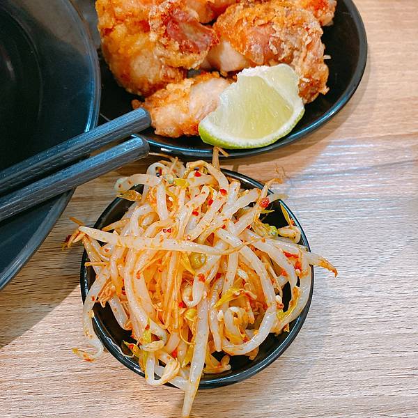 小菜是辣豆芽,無限自取,吃完吃不夠都能自由添加,冰水也是無限的唷