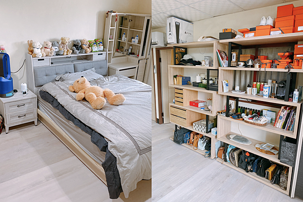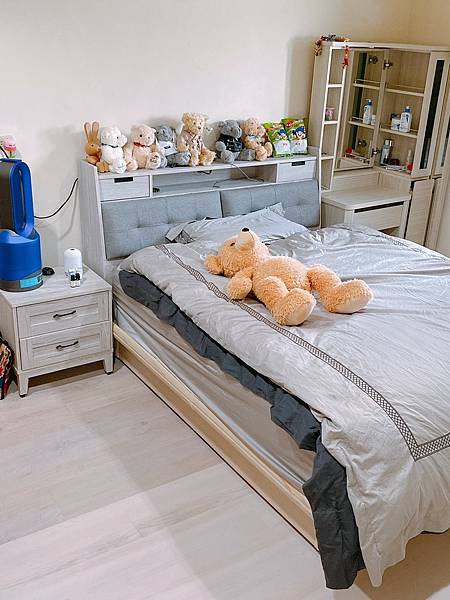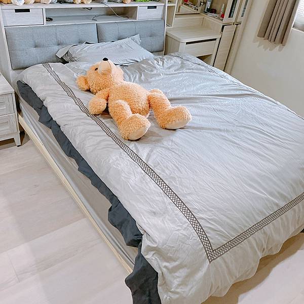 床的部分有做大幅度更換,除了把本來的床墊、被套都換上(被套是東妮寢飾的,很好睡很舒服),基本的雙人床大小,參考傢俱行建議換更能空間利用的掀床。