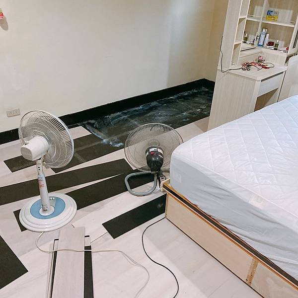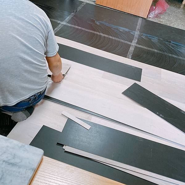 最重要的就是「地板」!!!因為我本來住的地方地板就是那種很復古的黑灰花崗岩的就是東西一掉到地上很難找得到的那種,我就整個鋪上了木質的塑膠地板,特別是在下層加上底料,這樣不會傷到本來的地板,同時未來要更換也方便,我整個人完全都不用搬出去,就是撲到哪移到哪,大概兩天就搞定。