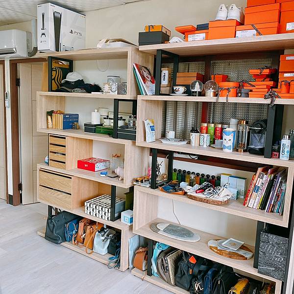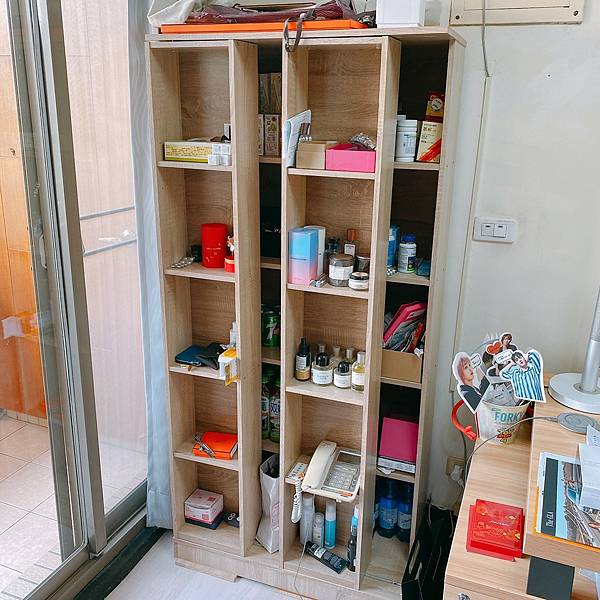 以及我邊邊還有這種活動式展示櫃,這好處是後面的東西會稍微擋住,就不一定都要放很美的東西,我大多拿來收納一些藥品、零食、飲料、水的。