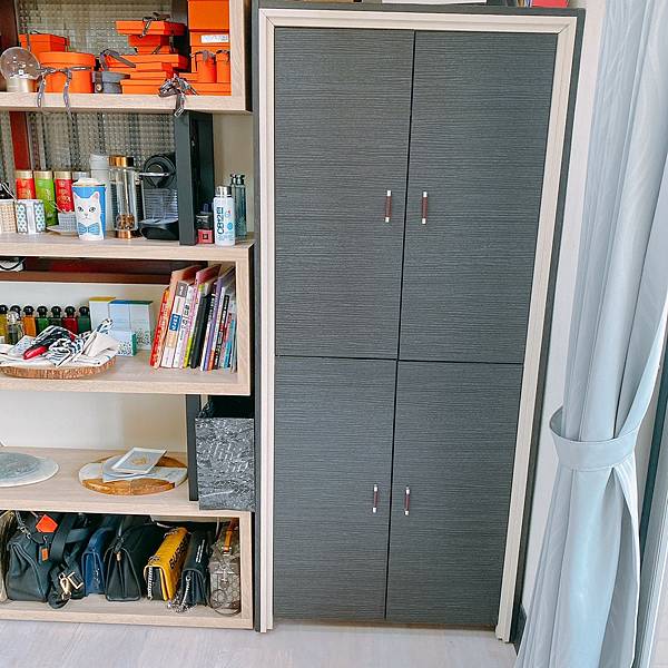 或者是我最邊邊這個是本來家裡舊的收納櫃,是可以開關門的,這種櫃子我覺得還是要有,因為一些很零散的東西全放進去關上門來,看起來都還是乾淨整齊。