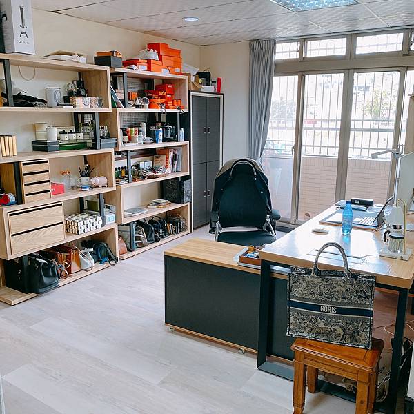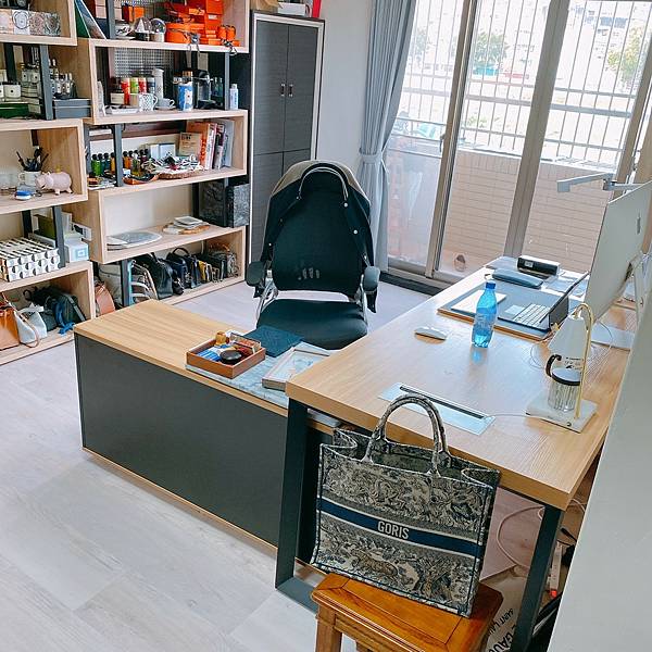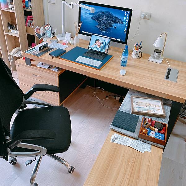 這款我是喜歡它大大的桌面、大大的L型,給我桌面空間非長大,右邊的活動櫃上面也都能直接做一個小桌面,很方便我放很多東西,甚至是拍照。