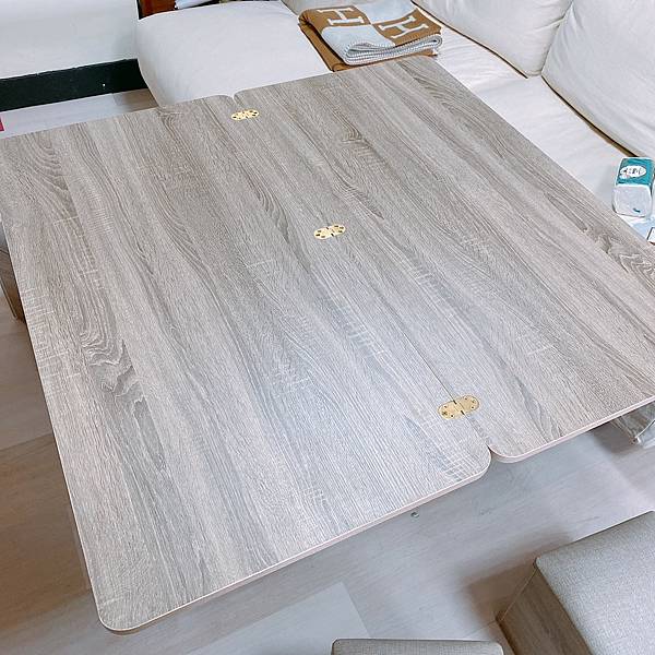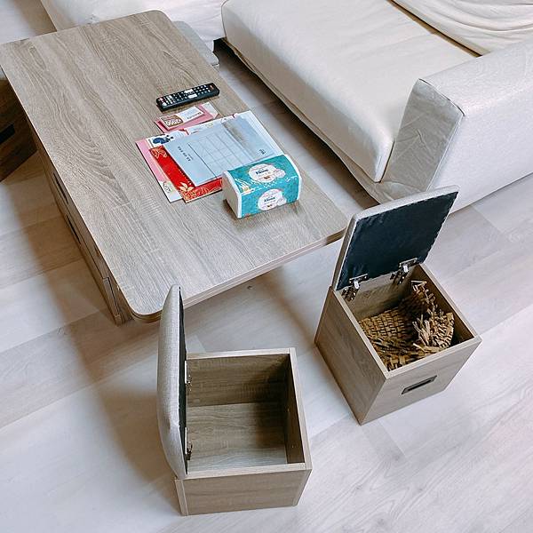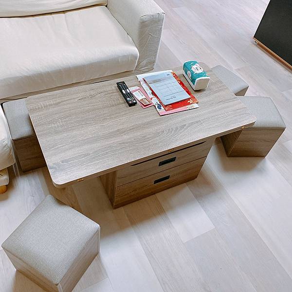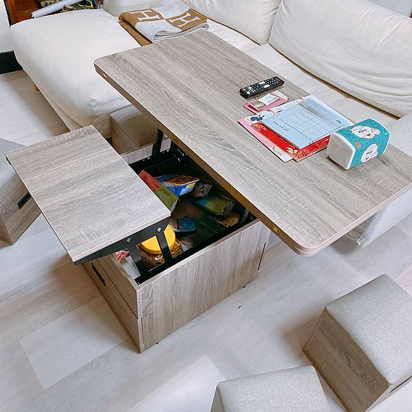 因為我現在住的地方,大部分都只有我一個人在家,爸媽大概一週會來一次,我妹外甥他們大概一個月一次,所以我那時就想說也不用擺到太多椅子,但能藏起來,必要時拿出來也很方便,就找到這樣的活動式茶几,兩側剛好有四個小沙發椅子,用不到就收進去,要用的時候再抽出相當方便。