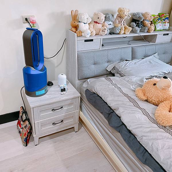 這格跟床頭配一組的床頭櫃,兩抽而已,單純配色配一起用來做為點安的床頭櫃,我主要放暖氣,還有一些簡單的東西,以及香氛機。