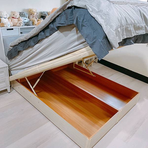 就這,其實不管你上面床墊多重,基本上還蠻好掀起的,運用那個油壓支架,往上抬就抬起來了,下面一整個就是非常可以利用的大空間。