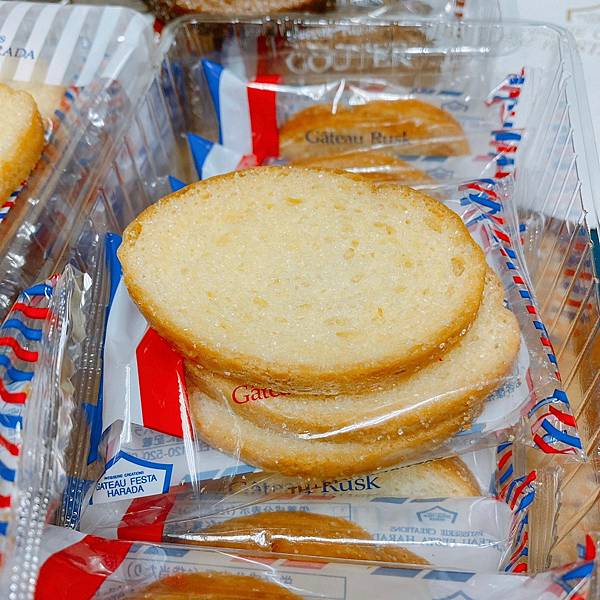 一包兩片,一次拆一包,不用梭哈!其實就有點像法國麵包切片,撒上糖粉、塗抹點奶油,然後烘烤這樣,就是最簡單的美味,其實有點類似我們台灣團購也很瘋的吐司條,不過Gateau Rusk Gouter de roi是比較講究和精緻些,吃起來同樣涮嘴,但卻是甜而不膩的口感,會讓人一片一片想要回味!我之前從日本都會至少買最大箱的80片,然後散包這樣,我爸很煩,坐在客廳看到打開就是一包接著一包、毫無感情的一直吃一直吃!一次可能吃了6、7包都沒在停的,我看到都會說:你可以放點感情吃嗎!!!哈哈哈,我爸就回我:蠻好吃的!..........