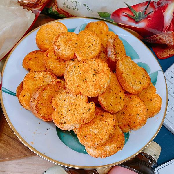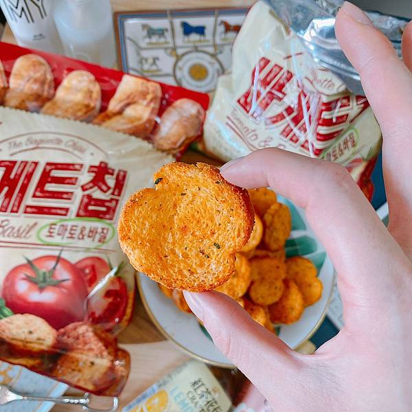 總之,我個人覺得新口味西西里風味麵包餅乾比原味好吃啦,原味的大蒜麵包餅乾我後來吃到最後面尾韻比較有甜膩感,但番茄口味爽口很多、我覺得好適合剝一些來拌在生菜沙拉、濃湯之類哈哈哈感覺好方便!