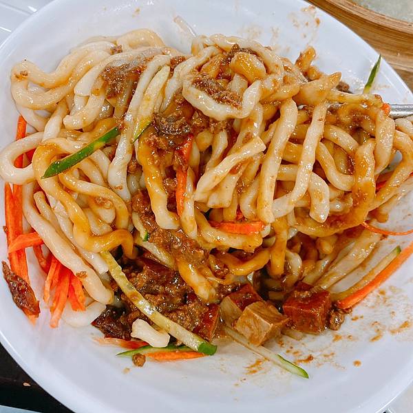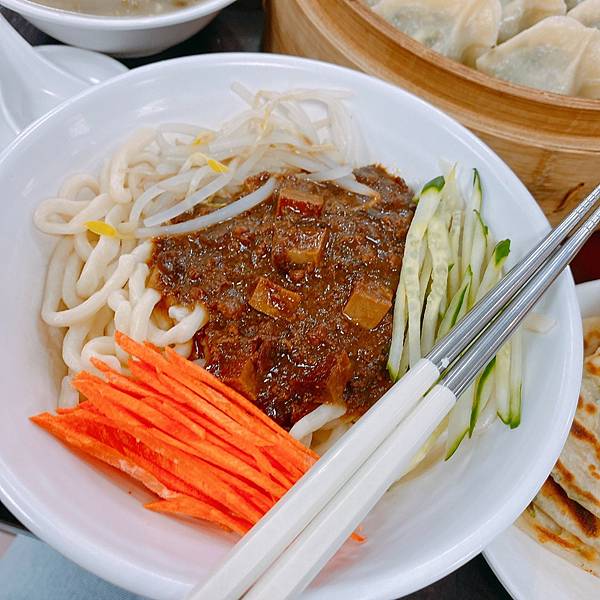附的配菜很不少,單是送上來就有紅蘿蔔絲、小黃瓜還有豆芽菜,然後淋上他們自製炸醬,裡面也有滿滿的豆腐,加上一大碗的麵,說真的份量有夠夠,拌勻後超療癒~一個人吃完真的會很飽的一碗。