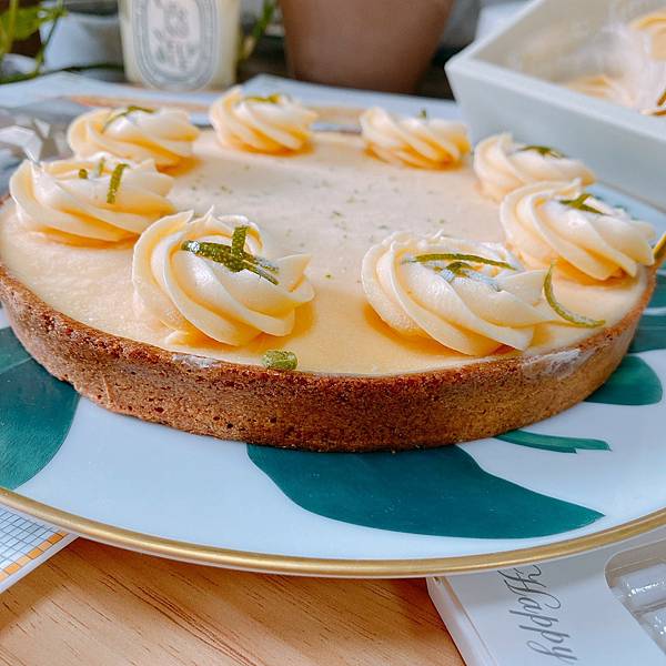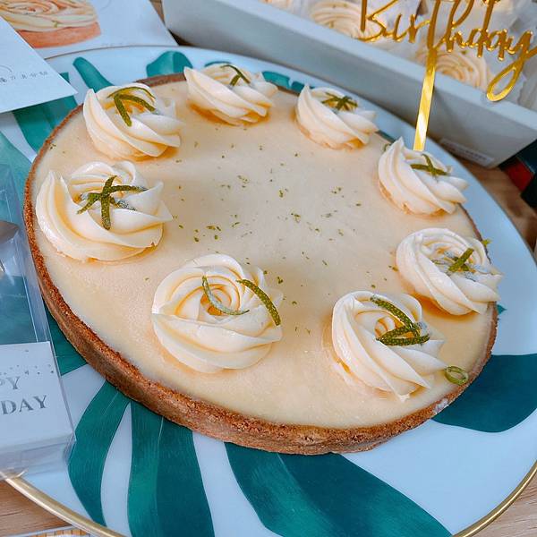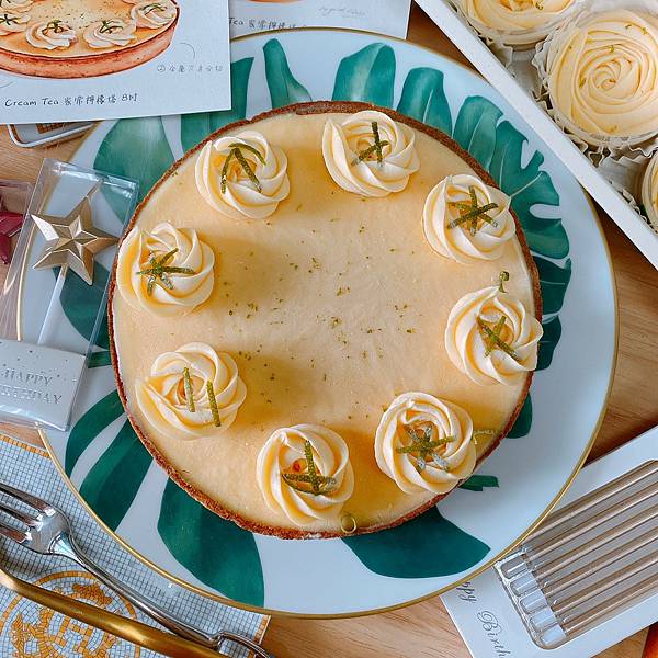 CreamTea 這8吋玫瑰家常檸檬塔生日蛋糕,好吃就好吃在他這個都是冷凍宅配來的,你常從冰箱拿出來、解凍、常溫後,那個塔皮都還是酥的、脆的,就這很優秀,不會跟你在那邊軟爛感,就這樣很好吃!