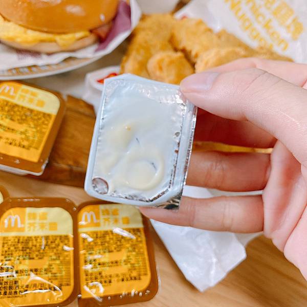 重點是,繼前陣子偷偷回歸的泰式甜辣醬後,終於也等到這真的也是沾麥克雞塊超級好吃,我個人覺得完全不會輸給糖醋醬的「蜂蜜芥末醬」回歸!有點甜甜酸酸辣辣的真的有夠喜歡,點4塊麥克雞塊就有喔!!!!整包醬料有夠滿!連塑膠套沾到的都不能放過很可以舔來吃!不像現在糖醋醬,好像都沒裝滿的感覺你們有發現嗎?