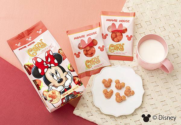 這真的最強就是將玉米果開模成米奇米妮的3D立體造型感,加上最新推出的米妮,儘管玉米果還是同樣的臉型,但透過外盒包裝調色的更粉嫩、更草莓,加上米妮的設計,打開來的包裝袋也特別換上了粉色還有蝴蝶結,加上又是相當適合米妮的草莓牛奶口味,讓整個米果呈現粉色感,看起來就完全是不同商品了!!!