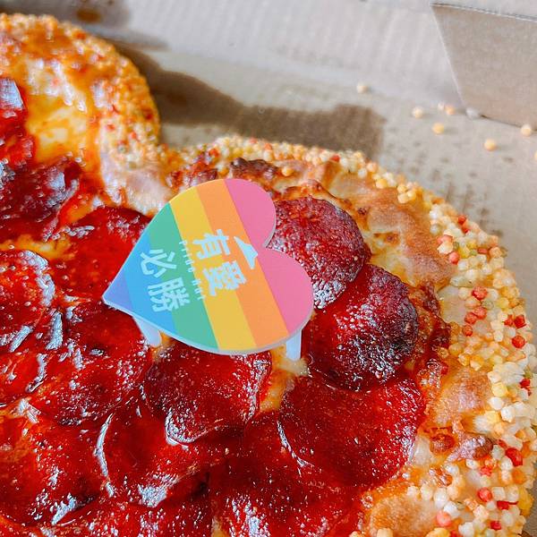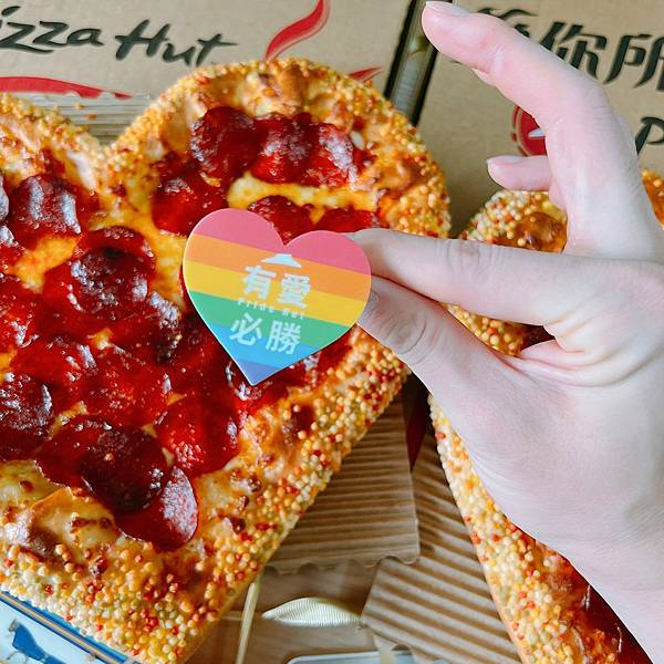 特別是PIZZA上面還有一個可愛的彩虹愛心有愛必勝的PIZZA固定支架!除了愛心彩虹,上面還有中文的有愛必勝,你仔細看,還有必勝客logo的帽子,英文還寫有Pride Hut !!!有夠可愛這真的好有紀念意義喔,特別是在這象徵彩虹平權的月份~重點是還很好吃!推推