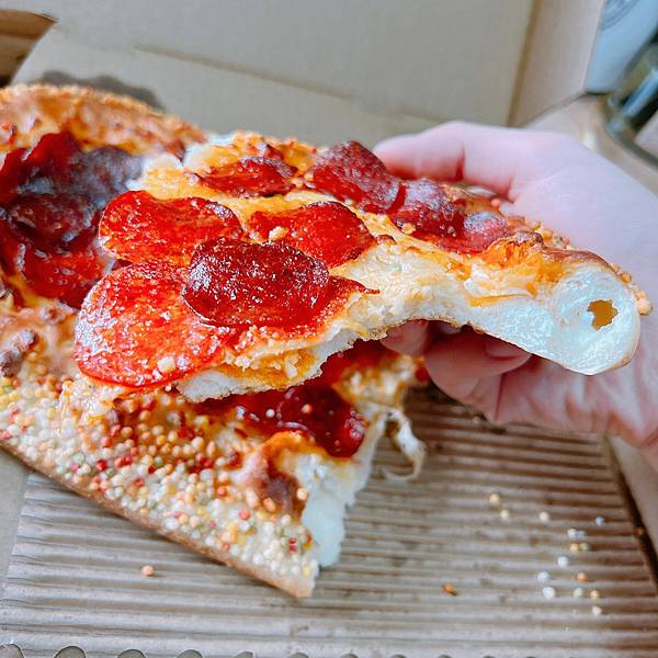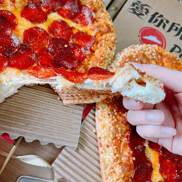 我跟你說!這次真的超值得吃的除了外型好看,味道沒再跟你亂來搞話題、搞噱頭的什麼香菜、皮蛋、豬血糕之類,就是好好的在做PIZZA!!!除了呼應愛最大彩虹平權外,整個心型為了呈現熱情的紅色,上面鋪滿圓形的美式臘腸很可愛,PIZAA餅皮雖然只有厚片,但愛心就是要這樣厚片澎澎的比較可愛,而且裡面滿滿的莫札瑞拉起司這很好吃耶,鹹鹹的也不太會膩,我覺得最厲害的是愛心框框那一圈一顆一顆淑真的我一開始也只覺得彩色的很美,但完全不知道是啥,我還以為是那種該不會跟我在那邊亂來,撒上那個小時後常常會在刨冰出現的七彩巧克力?