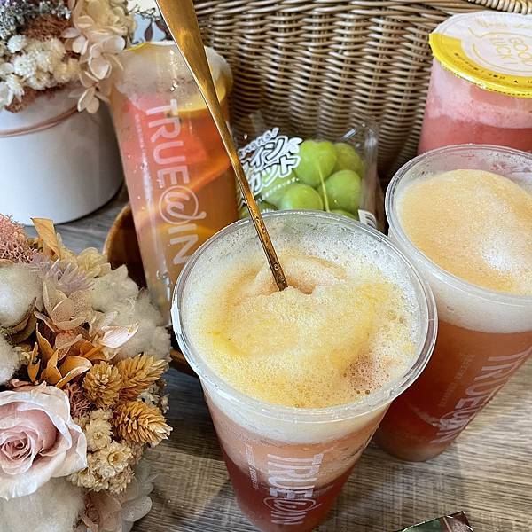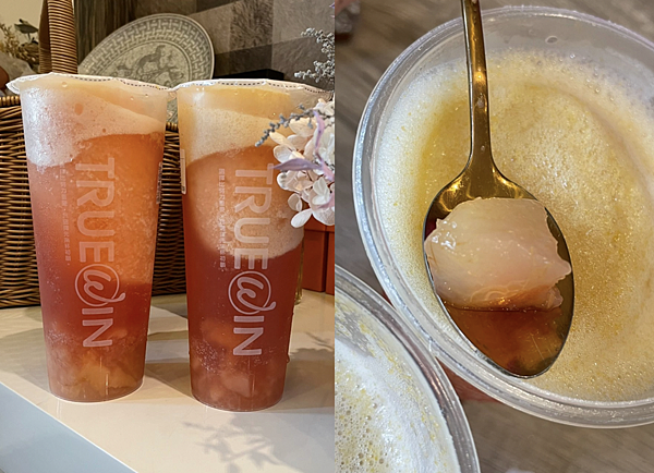 她問我要喝什麼,我說都沒喝過耶,但看到外面宣傳旗幟就是這「愛戀桃花韻」怎那麼難的名字!哈哈,反正看起來就是水蜜桃果茶就想說水蜜桃應該不會難喝到哪裡去吧?我們就全點了這個!!!