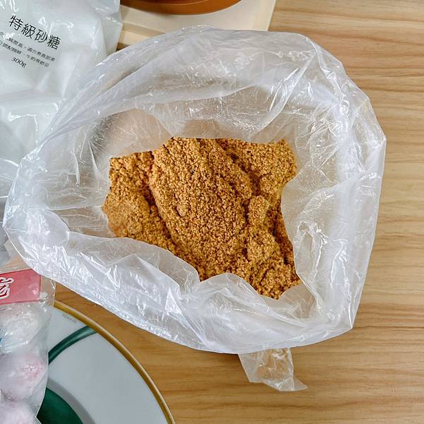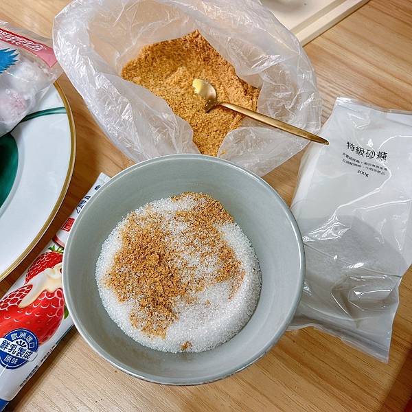 因為不要以為花生粉直接灑上去唷這樣不好吃會沒有甜味,請準備砂糖然後拌在一起,