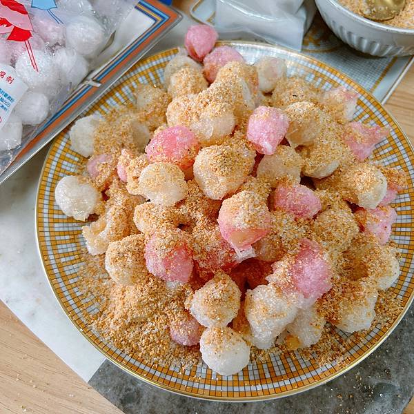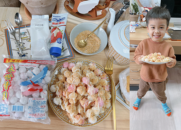 而且撒上剛剛調好花生粉+砂糖,這樣大概就是正常的花好月圓炸湯圓了!