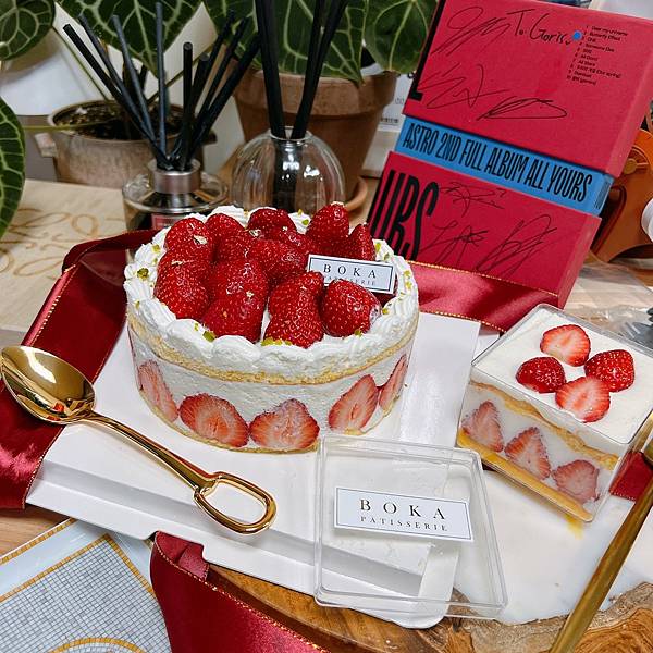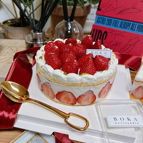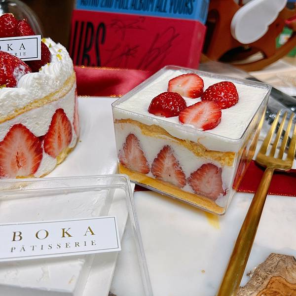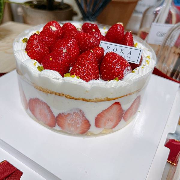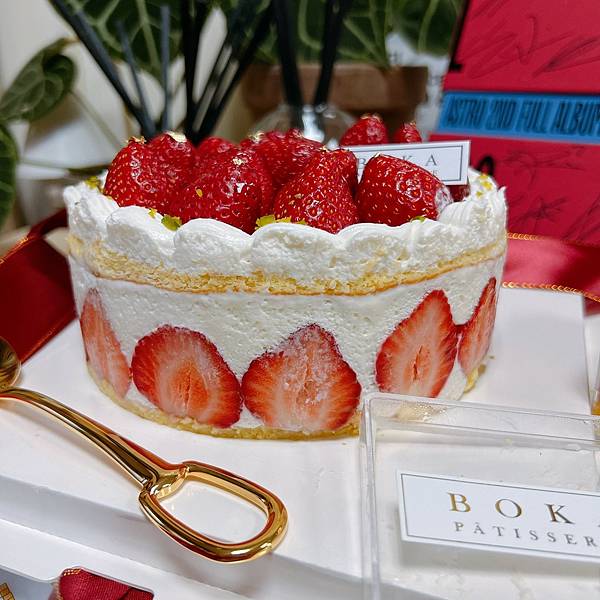 而且我喜歡BoKa一點是很多草莓蛋糕下面看起來都會很純白、白色鮮奶油感,完全看不到,有時候還要機會命運不確定蛋糕裡面有沒有沒有草莓,但BoKa他們家就是給你直接了當,旁邊都排得整整齊齊半切草莓,好拍又療癒~但切開來裡面還是滿滿草莓!整體我覺得是好吃的,是高級的,特別是那蜂蜜蛋糕的畫龍點睛,讓BoKa的草莓蛋糕比較與眾不同一點。