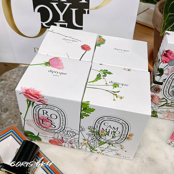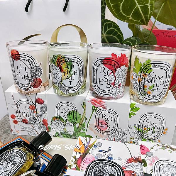 單是紙盒包裝360度6面滿版的都有圖案延伸相當美!!!最驚喜的是抽出蠟燭除了燭杯對應每一款味道都有專屬的顏色外,包括貼標也都全新設計結合花藝的有夠好看的!!!我不太知道該怎麼形容這4款玫瑰、洋薊、荔枝、洋甘菊香氛蠟燭的味道,因為味道就很單一,就分別是玫瑰、洋薊、荔枝、洋甘菊的味道!!!我覺得概念應該是在這4個味道結合一起就是diptyque玫瑰之水的4大香氛結構,我是覺得很有概念,就是把一瓶香水拆解成分在單一做成香氛蠟燭,又配放有視覺印象的設計,讓你看得到香氛、聞得到香氛、感受得到香氛的完整感受,很不錯很值得收藏!我特別喜歡洋甘菊,聞起來好放鬆舒服舒壓!
