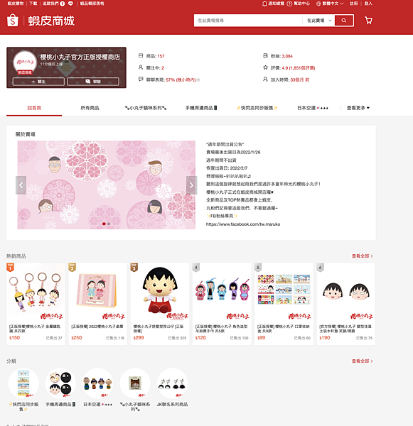台灣的櫻桃小丸子官方正版授權商店蝦皮商蠻好逛的,裡面很多小丸子可愛商品,都是正版授權!