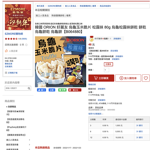 我跟你說~佛心來的!目前全部口味一共6款,包括巧克力吉拿棒、原味玉米濃湯、海苔、麻辣、烤麻糬,然後最新的就是松露,訂價跟其他口味同樣都是65元之外,我在網路蝦皮、樂天上查到一包50有找只要48元!!!根本都比我去全家買其他口味的烏龜餅乾還要便宜好多喔!!!那當然當然要吃松露的啊!哈哈哈