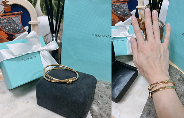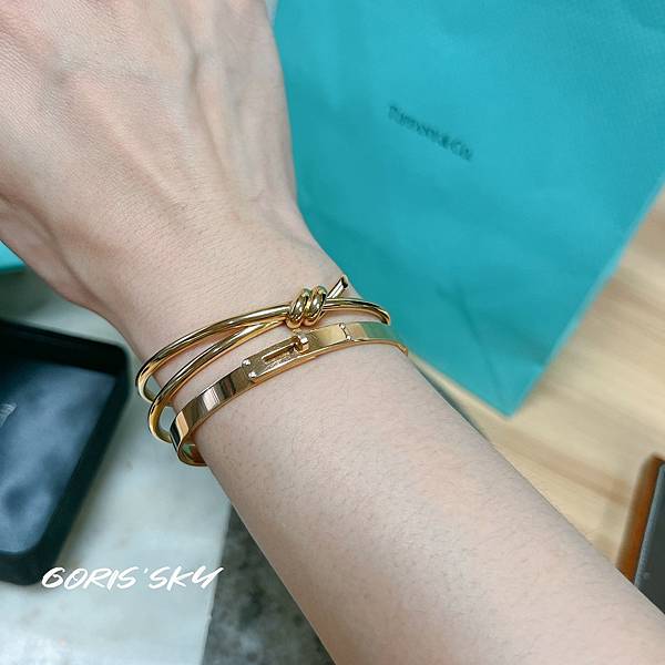 跟其他的硬式手環疊戴也融合的好看,因為TIFFANY & Co. Knot雙排鉸鏈手環呈現可以剛也可以柔,加上其整個比較圓滑、百搭的設計,所以跟其他配都不會很突兀。