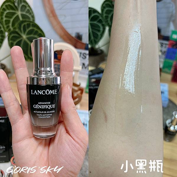 再來是蘭蔻「超未來肌因賦活露」,小黑瓶基本上不用多說了吧,就是精華液中如呼吸般自然的存在,日常日夜保養用它,維持肌膚穩定性,嫩亮緊緻水潤感,特別是針對像是粗糙顆粒、粗大毛孔、暗沈、乾燥、鬆弛等主要肌膚困擾,明顯能感覺肌膚被升級,從粗糙變柔嫩、由暗沉轉透亮,同時皮膚Q彈、水潤、緊緻!