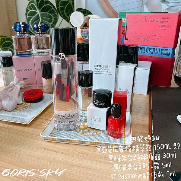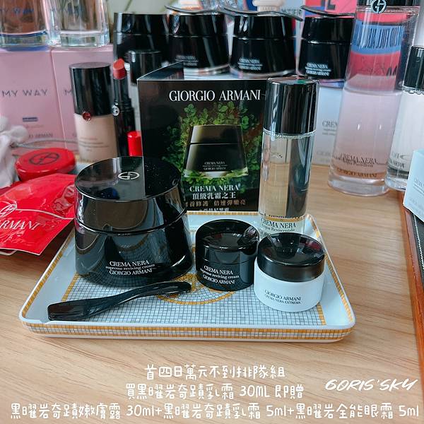 輕奢小資入門GIORGIO ARMANI頂級黑曜岩保養首推如精華水面膜的粉水-黑曜岩奇蹟精萃露!!!一拍就能柔潤肌膚,三重玻尿酸因子密集補水,不僅補水還鎖水+儲水,天天濕敷更是急救面膜讓肌膚穩定、快速喝水、味道療癒如SPA,這個試過就會很懂的買1直接送你30ml嫩膚露,可以先擦去肌膚老廢角質、髒東西,更透亮外,還有頂級修護的黑霜直接送到5ml一罐外,連香水都很直接的給你7ml小香!!!