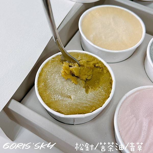 我最喜歡粉色的「蓮霧|荔枝|天竺葵」口味,玫瑰荔枝草本花草的香氣吃起來浪漫又好吃;「松針|苦茶油|青草」很驚喜,那草木的清爽,以及青草的餘韻,很有質感的大人味;「葡萄柚|鐵觀音|山茼萵」蠻酷的,水果茶香的淡雅少香,是一種味覺全新感受。