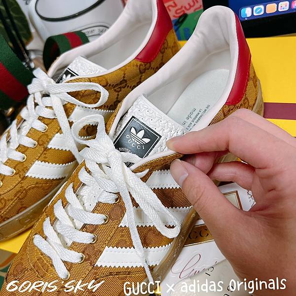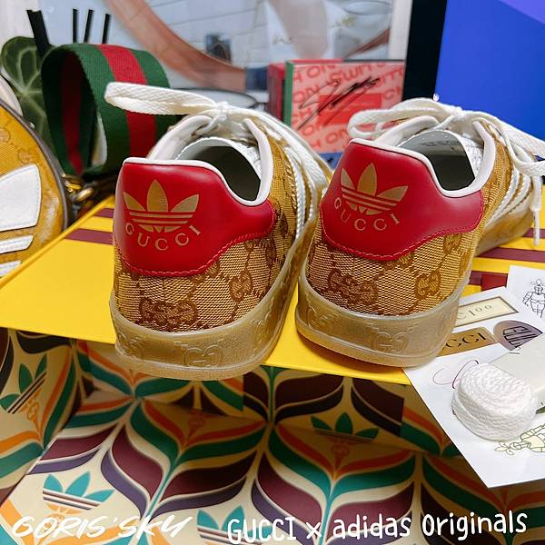 後踵護片這有經典adidas的設計,但轉換成GUCCI x adidas Originals聯名 LOGO,我是對紅色沒有很滿意啦,但就算了。