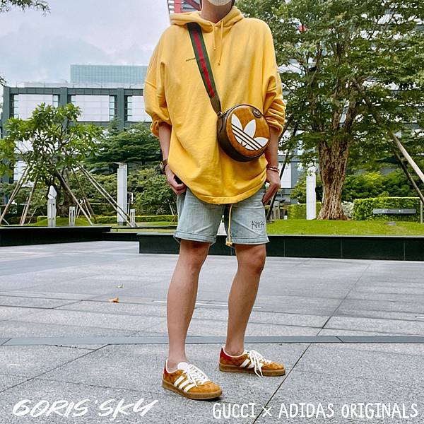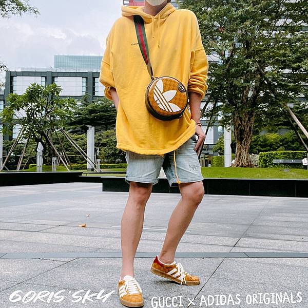 小圓包我選的就是GUCCI經典防水緹花LOGO,經典的綠白織帶背帶,然後上面有著醒目adidas Originals白色三葉的皮革,我覺得完全很平衡兩個品牌聯名感