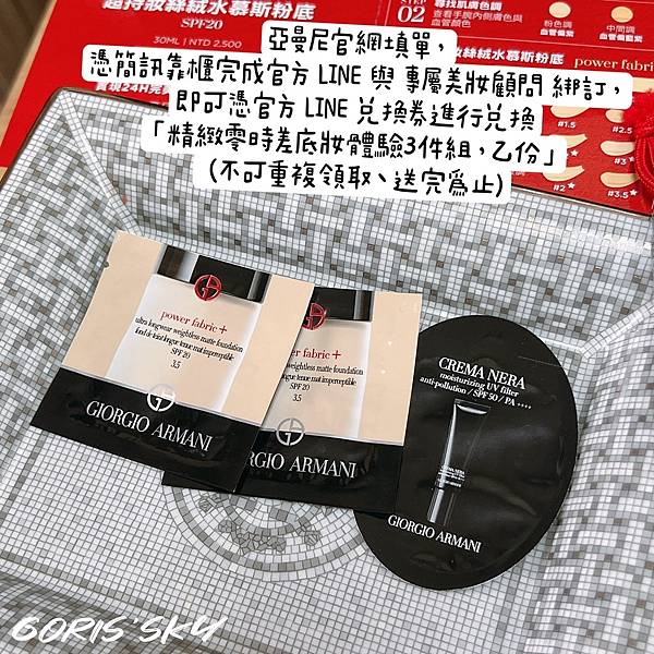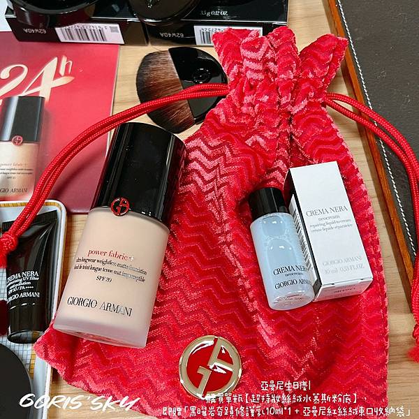 然後7/7開始的亞曼尼先生生日慶,就是購買單瓶【超持妝絲絨水慕斯粉底】 ,即贈「黑曜岩奇蹟修護乳10ml*1 + 亞曼尼紅絲絨束口收納袋」!