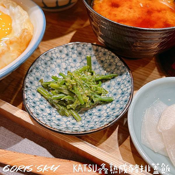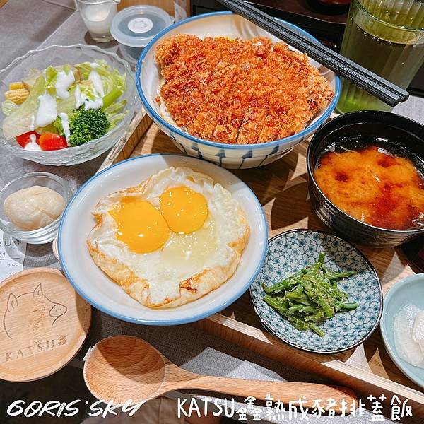 事前我做過功課,豬排飯下面其實有兩顆蛋,但就因為蓋上去看不到,我想說我多點兩顆蛋(店員還還跟我說這樣你會有4顆蛋喔!!!我說沒關係~我想拍照哈哈),結果上來的畫面我太開心了整個蛋看起來太美好、太喜歡,附餐有一些涼菜、漬物、味噌湯,我多點了一份沙拉。