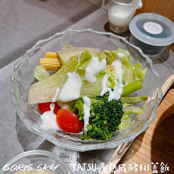 KATSU鑫熟成豬排蓋飯會點沙拉單純是因為炸豬排關係,我想說多點一些菜來搭比較不會膩,搭配的他們自製優格醬,真的配一起吃去油解膩不錯。