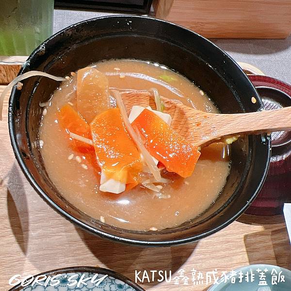 KATSU鑫熟成豬排蓋飯副餐的味噌湯熬煮用量上也看得出用心。