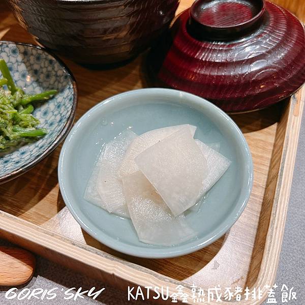 KATSU鑫熟成豬排蓋飯副餐還有漬物脆蘿蔔,也很幫助你解膩配炸豬排