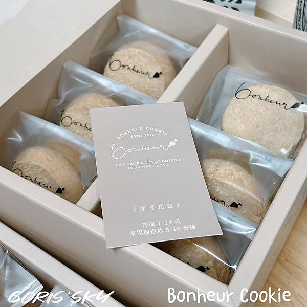 最多人推薦Bonheur Cookie的基本上就是達克瓦茲,收到後可以冷凍7-14天,然後也有提醒吃之前必須室溫退冰5-15分,趕我個人經驗是15-20分比較保險,不然會有點太硬。