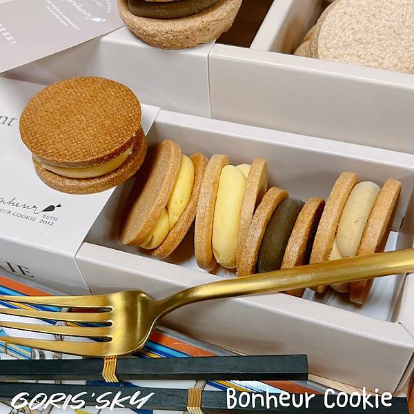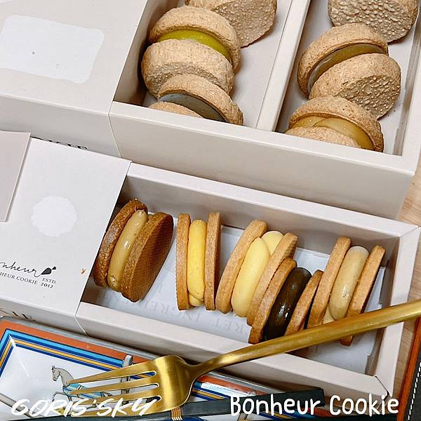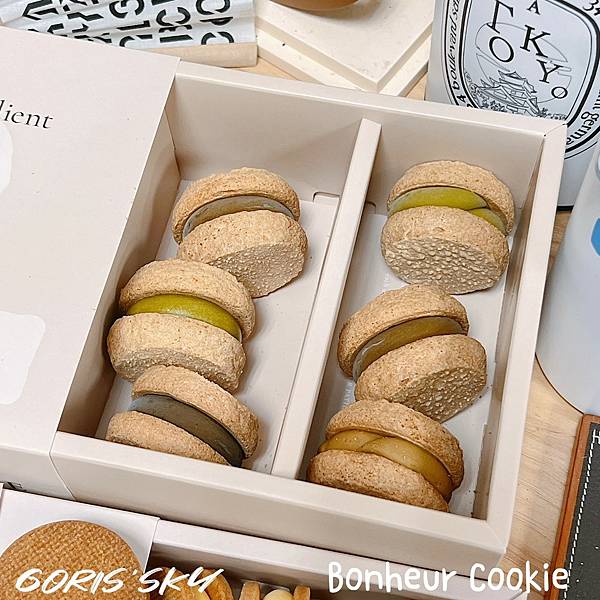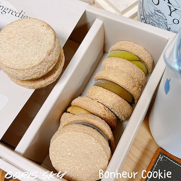說真的,我真的對達克瓦茲一直以來都很還好的吃不懂,但身邊好多朋友好喜歡,之前也有網友跟我推薦Bonheur Cookie但真的是訂不到耶!!!結果收到我吃了瞬間懂為什麼很多人推Bonheur Cookie了,因為外層的蛋白餅可能大家都會做,但Bonheur Cookie的內餡選材你吃得出質感、用心以及層次,在主要內餡之外,內裡細節藏著像是果肉、上等的法國奶油、日本的上白糖等,然後可能還有個口味獨有的茶粉,整體吃起來不會甜膩,甚至是質感,我這盒綜合的包括有烏龍桂花奶霜、蜜香紅茶雪鹽奶霜、雪鹽奶霜金萱、摩卡可可奶霜等口味,吃得出高雅的細緻質感。