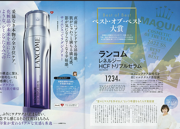 蘭蔻這「超緊顏抗痕亮采三效精華」去年底國外一推出就造成轟動,日本年初一上市才半年時間,就拿下VoCE、MAQUIA、美的等雜誌大賞甚至是綜合推薦第一名!!!都是有圖有真相,看得懂日文的應該會更清楚!