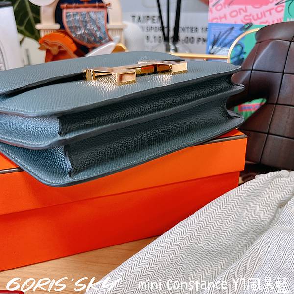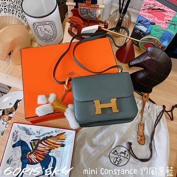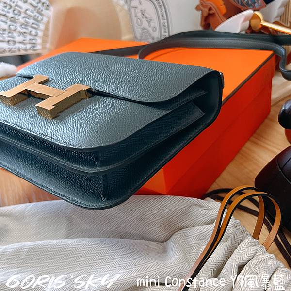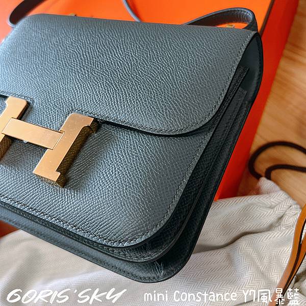 因為我答應店員不能在文章講配比,不然他們會被罵,我只能說我挑了一件外套、一個帽子、一支手錶、一雙鞋、一個手環、一個紙鎮、一條絲巾差不多就這樣吧我有點忘了,然後順利拿到這個mini Constance風暴藍,這個顏色說真的之前專櫃問過我我真的興趣度還好,因為我一直覺得跟我本來有的杏仁綠有點像,但實際比較其實更沈穩、更有味道,我朋友也說很適合我,就帶了!!!