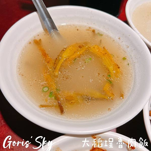 湯品的部分主要是金針湯或是蘿蔔湯,都可以選擇要不要加拐,古早味的湯,蠻鮮甜的金針,但比較不是那種盅的金針湯。