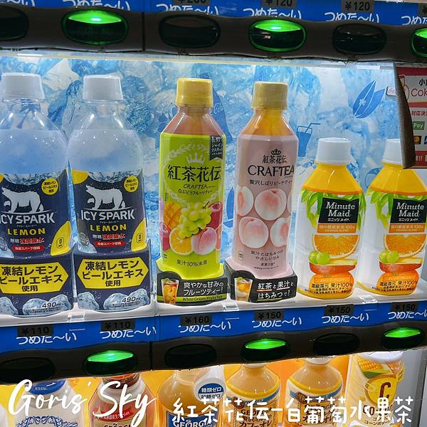 稍微比較一下,自動按販賣機就有賣這水蜜桃紅茶、白葡萄水果茶,一瓶大概日幣150、160日幣不等,販賣機就是方便,我也是會投來喝,又能Suica Pay省事