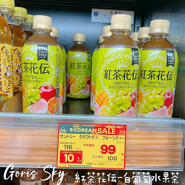 但來日本這麼多次了,我現在學聰明會去超市、或是藥妝店找,價格真的是比自動販賣機、超商便宜超多!!!單就這次新款的白葡萄水果茶就100日圓有找,這樣也才22元左右,水蜜桃紅茶更划算,才88日圓,一瓶不用20元!!!!這是什麼飲料價格~真的是太欠喝了!!!!
