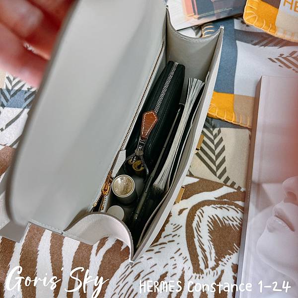 HERMES Constance 1-24長夾會有點為難,但其他東西這樣放一放,也可以說很夠放、很可以了。